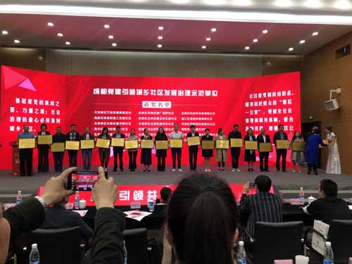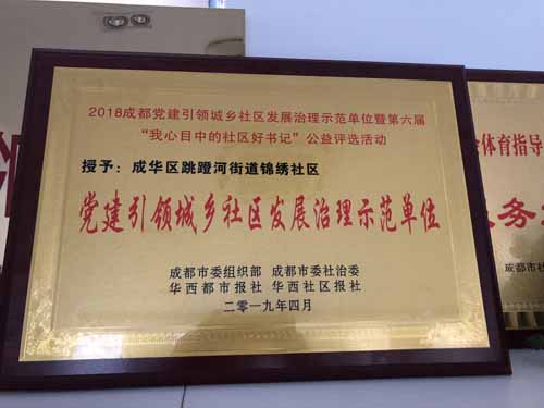 为深入学习贯彻党的十九大精神,总结基层党建工作经验,褒扬勤政务实、致力为民的社区好书记,在成都市委组织部、市委社治委指导下,华西都市报、华西社区传媒联合启动成都党建引领城乡社区发展治理示范单位公益评选。2019年4月12日,由成都市委组织部、市委社治委指导,华西都市报、华西社区传媒联合主办的,成都党建引领城乡社区发展治理示范单位公益评选颁奖典礼隆重举行,一批在基层党建、城乡社区发展治理、乡村振兴工作中成绩显著的集体受到表彰。跳蹬河街道锦绣社区获得成都市“党建引领城乡社区发展治理示范单位”称号。(文:蒲桂英)